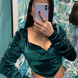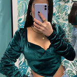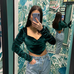 Crop top verde bottiglia in ciniglia, con scollo a cuore, coppe integrate e taglio a punta davanti