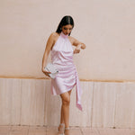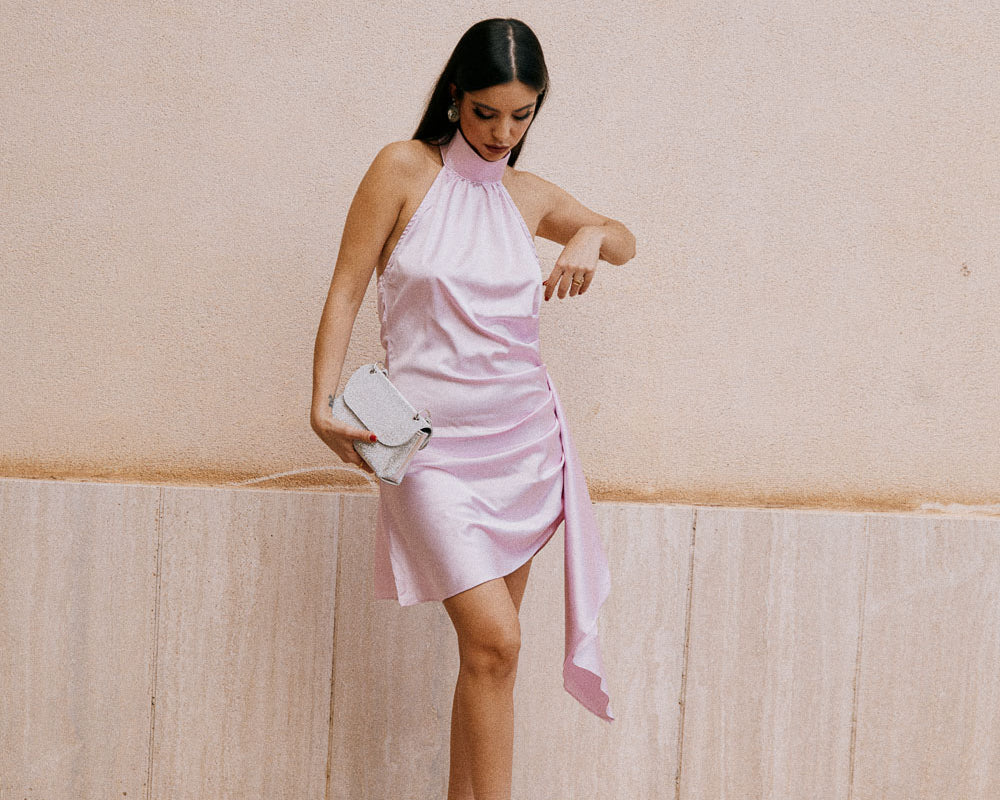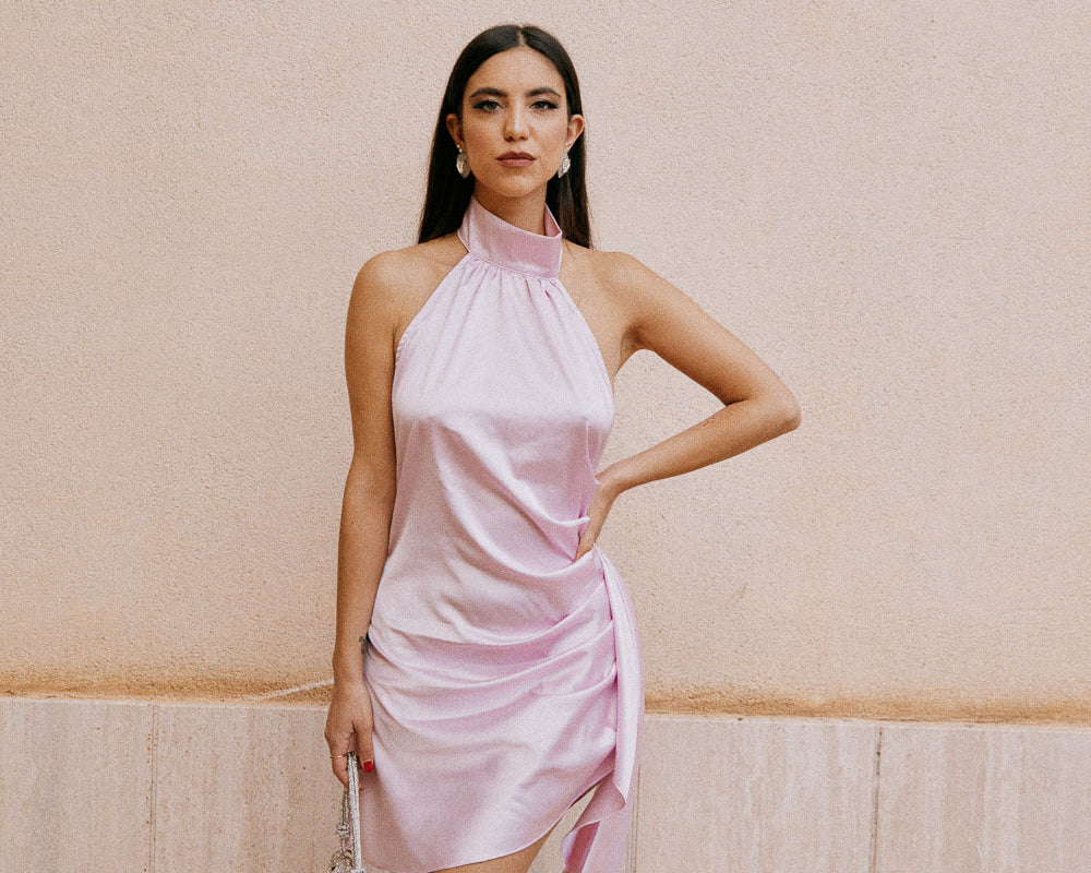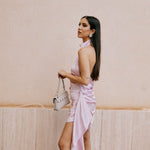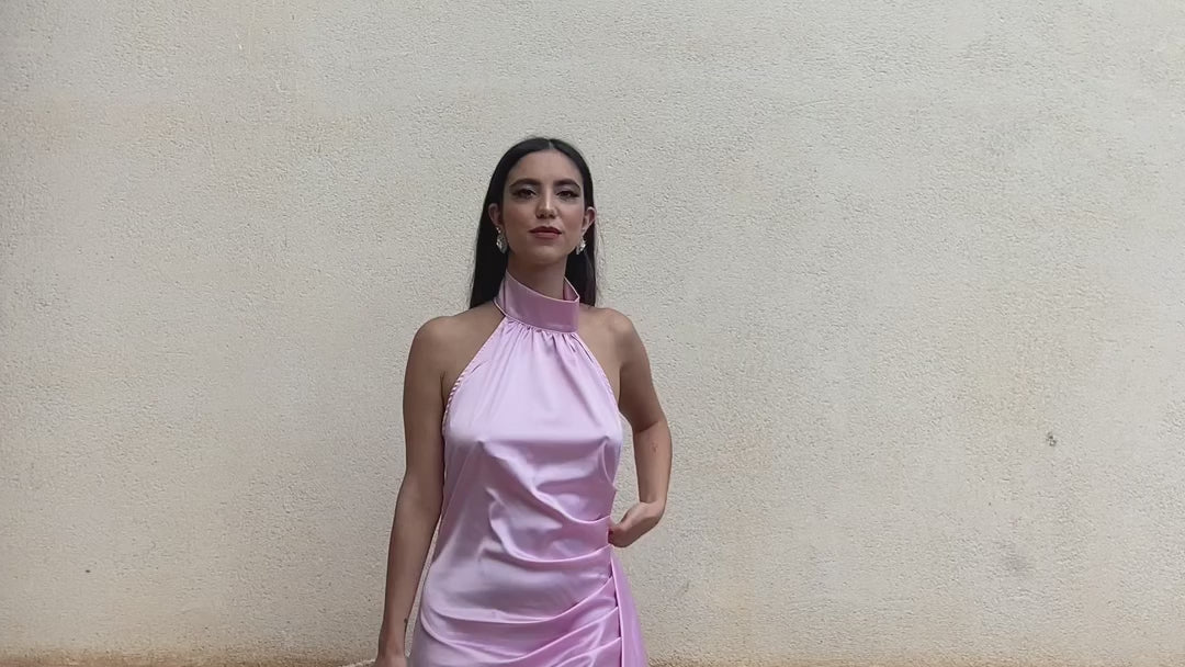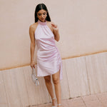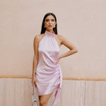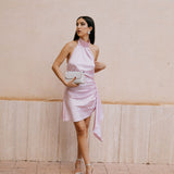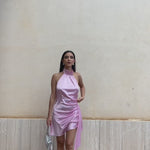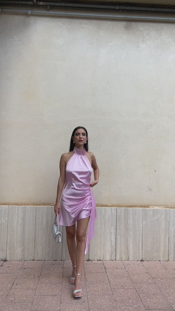Mini dress rosa barbie in satin con scollo all’americana, schiena nuda, drappeggio frontale e rouches. Vestibilità regolare. La modella in foto è una taglia Xxs ed è alta 1,62 cm