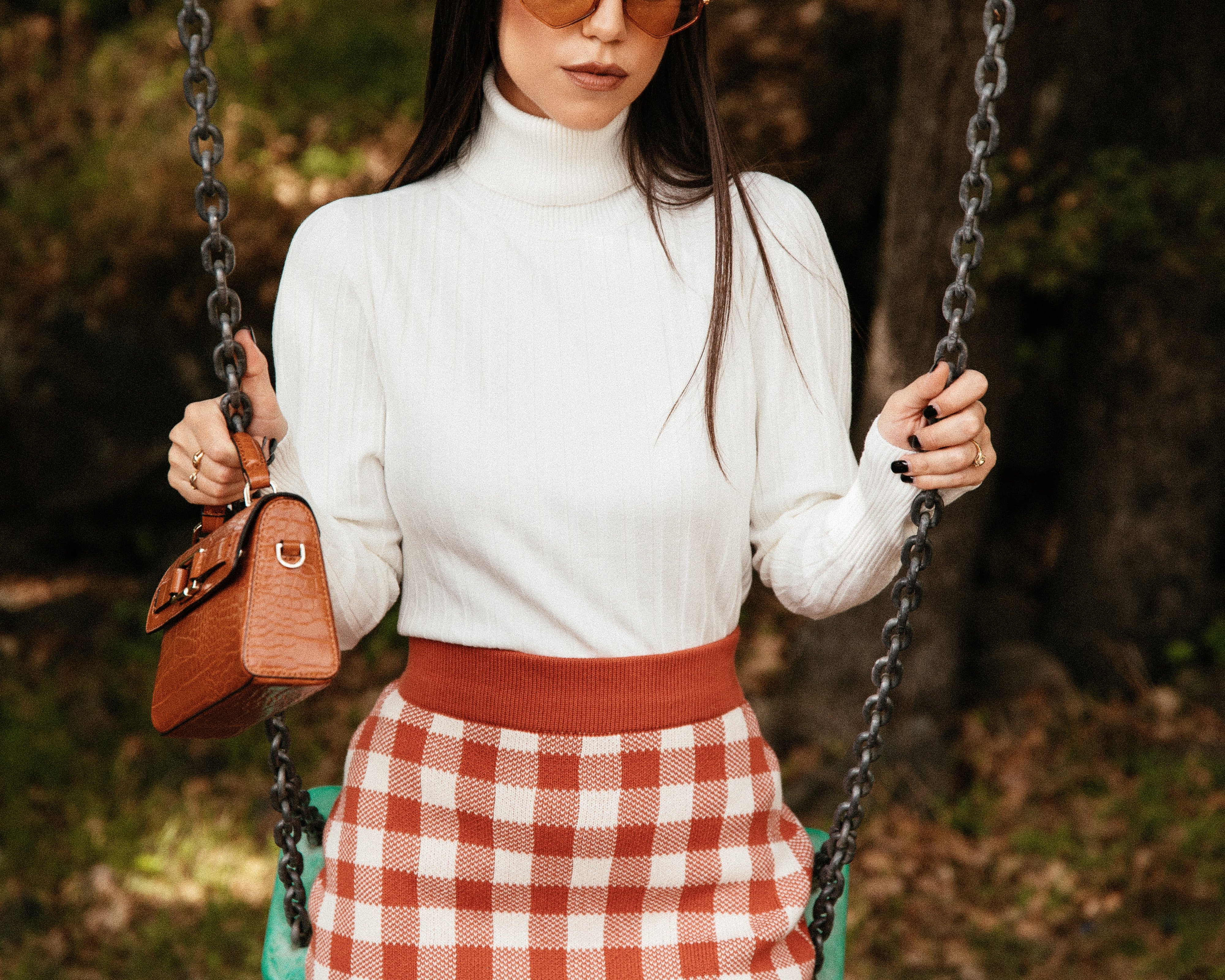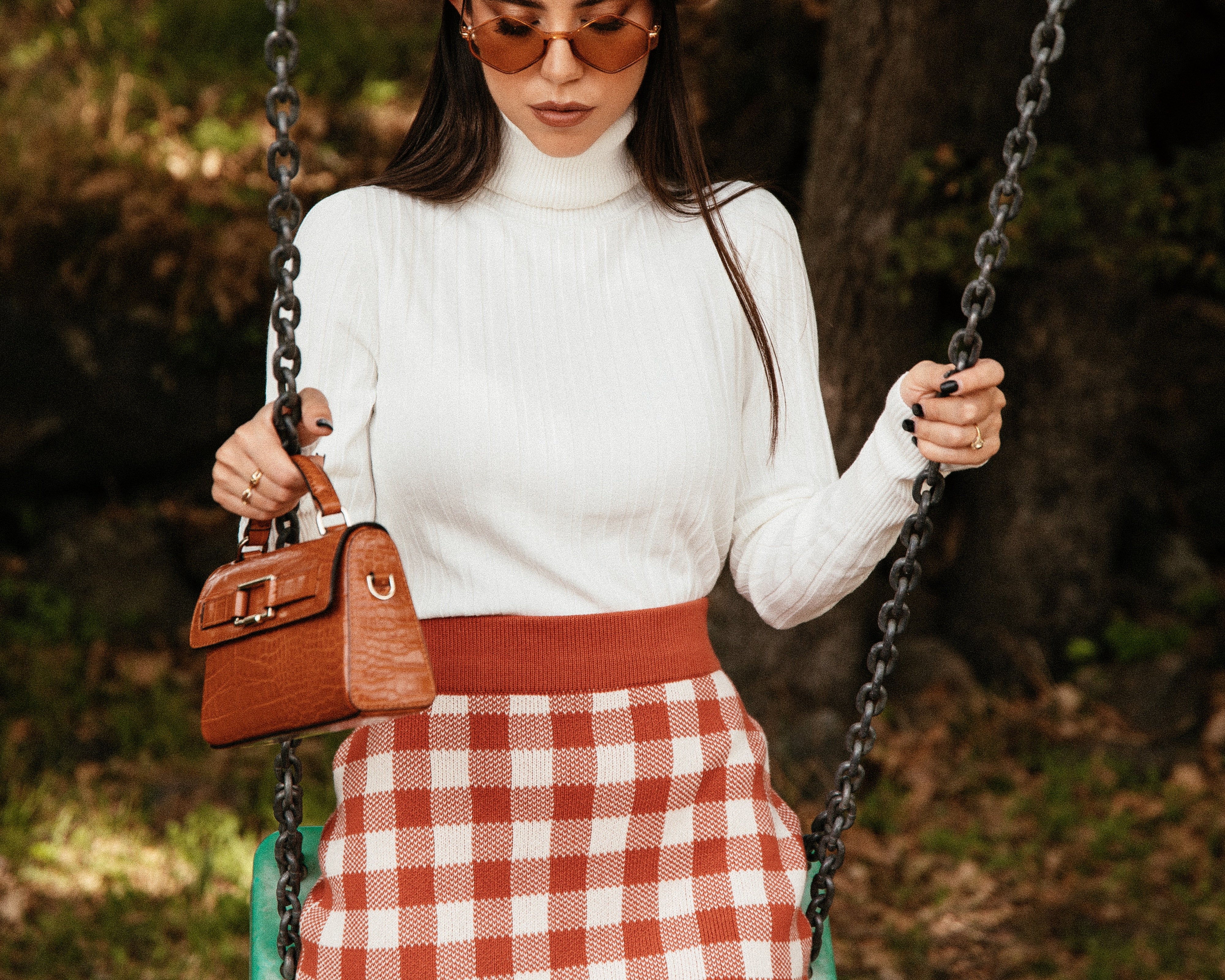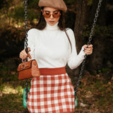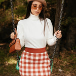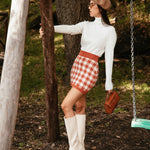 Minigonna a quadri nei toni del burro e del ruggine, molto elasticizzata