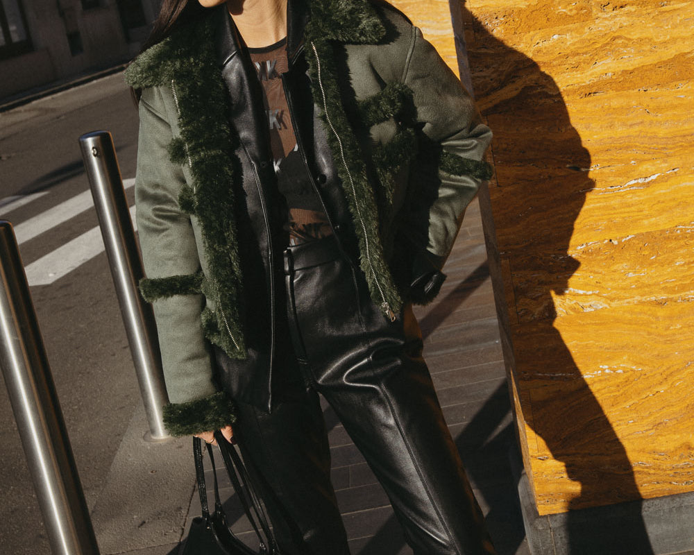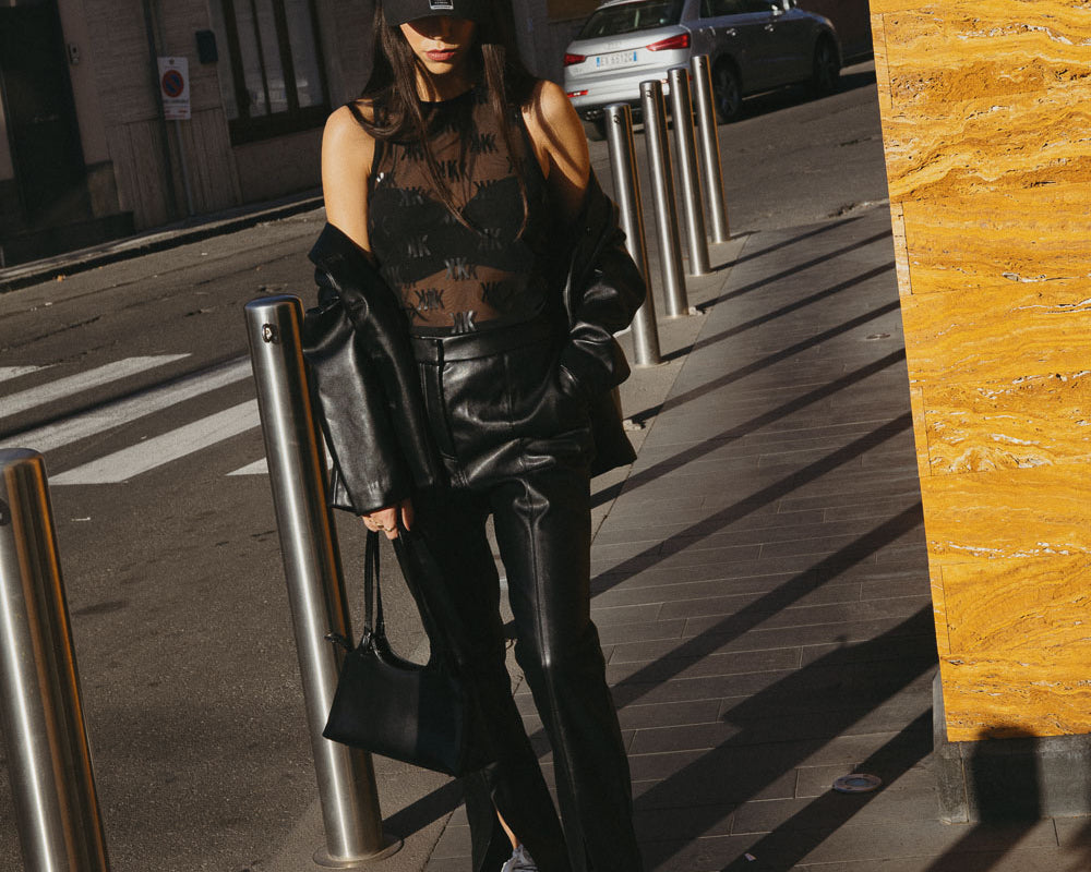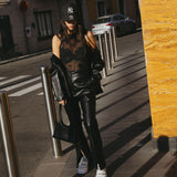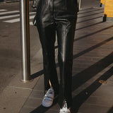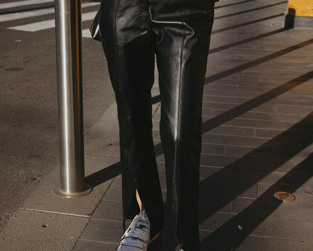 Pantalone ecopelle modello flaire con spacchetto centrale, caldo all’interno